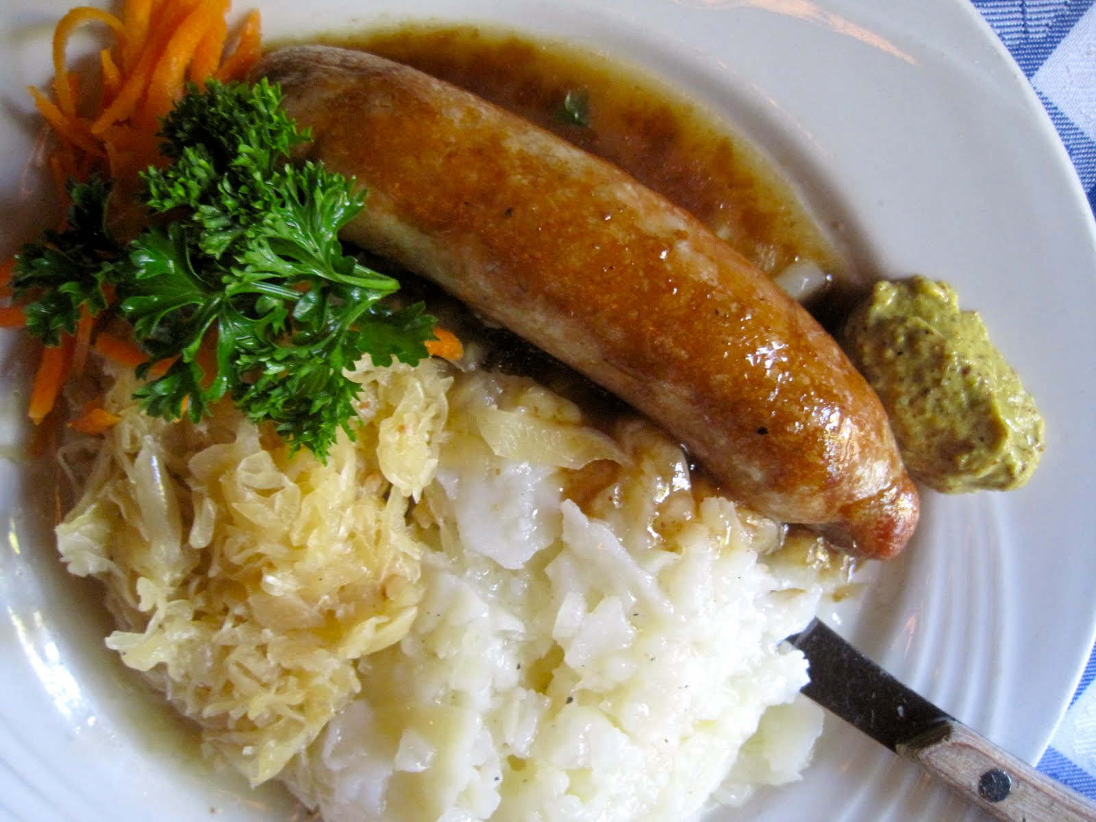 I ordered a (delicious) bratwurst with sauerkraut and (amazing) potato salad. Our folk-dressed and German-accented waitress left an entire jar of brown mustard for me, so I was a happy camper.